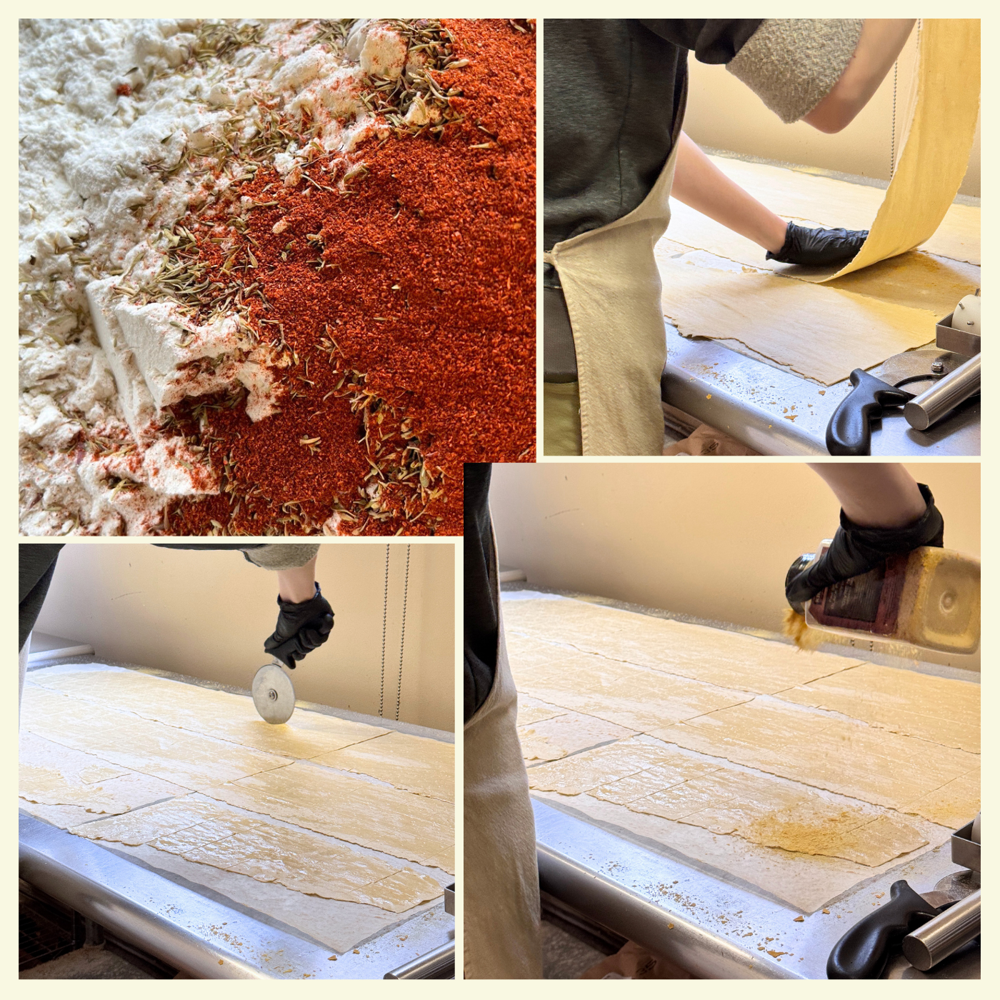 Each batch of our crackers is a little labour of love, made from scratch just as Jenny’s grandmother taught her. We mix, weigh, and roll the dough with the help of machines, then hand-cut and dress each cracker before it goes into the oven. It’s careful, hands-on work that honours tradition, and it’s where the magic of flavour begins.